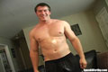 So while Trevor was doing his shoot, his workout buddy, Shawn, was sitting just off camera taking it all in. And even at times coaching Trevor on what poses to do. Trevor doesn't seem to mind us watching and just goes at it, pumping out a sticky pool of protein onto his stomach.