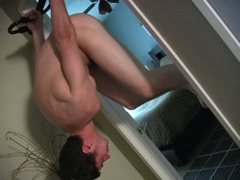 After Corey blew all over his chest and was heading in to wash up, he found the pull-up bar and did a little showing off of his upper-body strength from his gymnastics days. Still covered in his load.